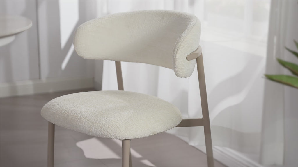 Der Natascha Stuhl vereint modernes Design mit angenehmem Sitzkomfort und wird so zu einem stilvollen Highlight in jedem Wohn- oder Essbereich. Der weiche Chenille-Stoff in edlem Elfenbein verleiht dem Stuhl eine besonders warme, elegante Ausstrahlung und sorgt gleichzeitig für ein angenehmes Sitzgefühl.